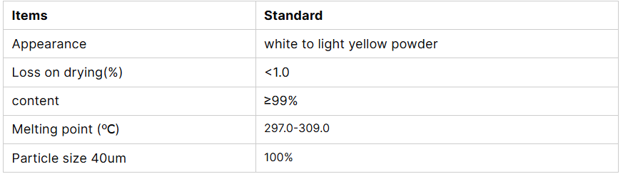این ماده یک جامد کریستالی سفید رنگ، محلول در آب و برخی از حلال های آلی است که پایداری حرارتی و شیمیایی نسبتاً بالایی دارد.